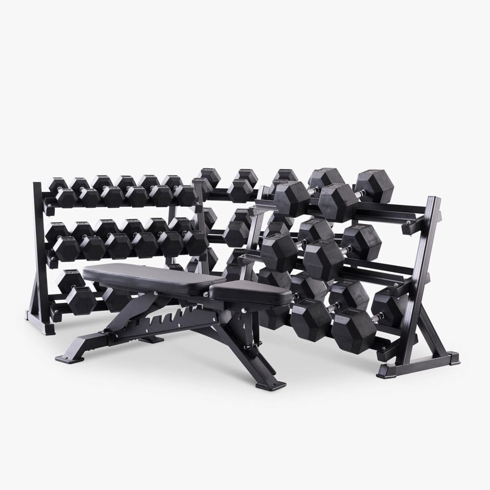 Hex håndvægte (sæt, 7,5-50 kg) inkl. stativ og justerbar bænk