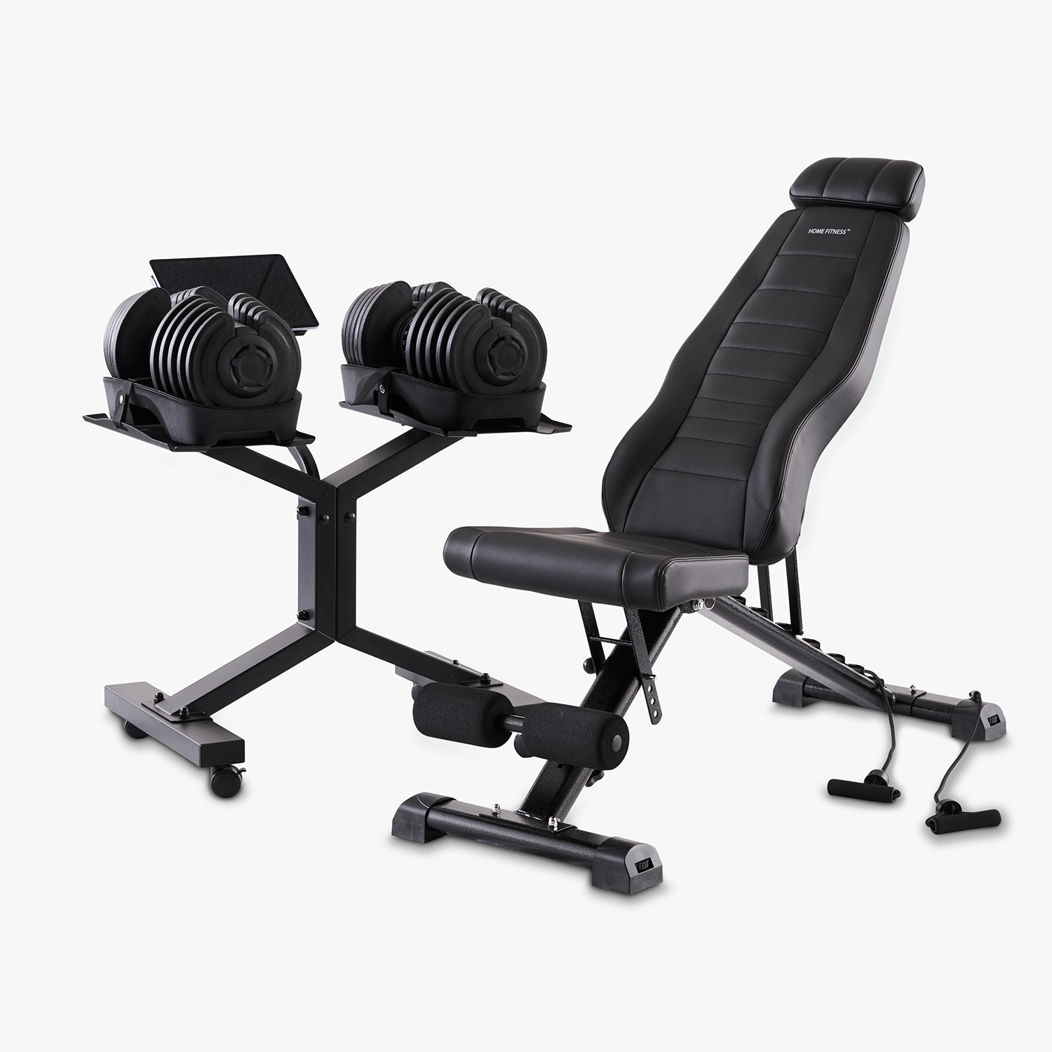 Udover håndvægte og træningsbænk, får du også et robust og stilrent sort stativ med til håndvægtene, så